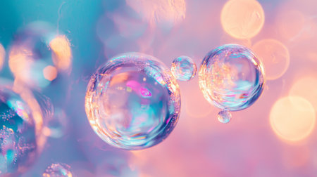 A delicate scene featuring translucent soap bubbles reflecting soft pastel colors, floating against a dreamy blurred background, evoking a whimsical and playful atmosphere.