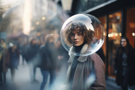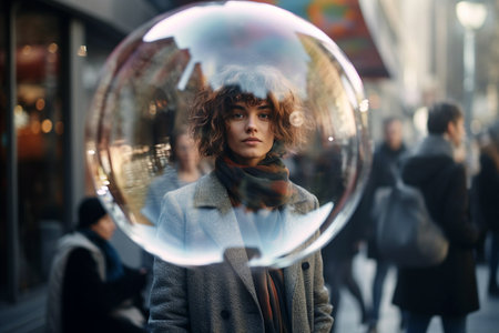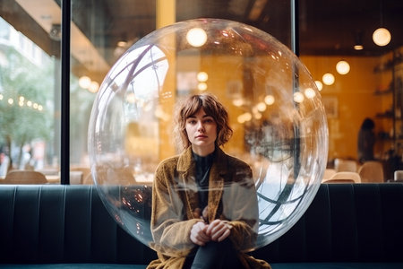 Woman inside a big soap bubble, introvert, loner, living in solitude, recluse. Mental health, psychology concept, inner world, shyness, hiding identity, dreaming, antisocial, alone, avoiding people.