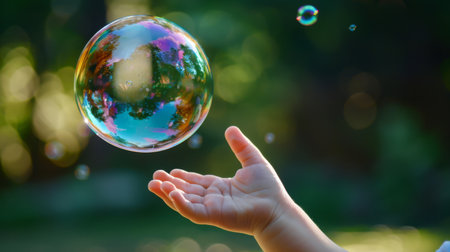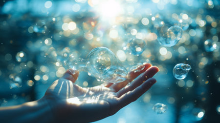 A captivating scene featuring holographic bubbles floating gracefully above a hand, creating an ethereal atmosphere filled with color and light reflections.