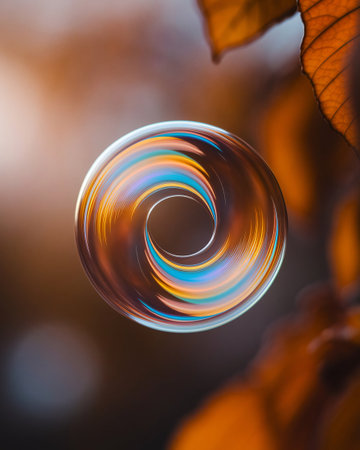 Close-up of a soap bubble with iridescent colors, swirling patterns, and blurred autumn leaves in the background, creating a mesmerizing visual effect.