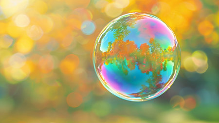 Bubble reflecting sunset with bokeh background, artistic photography concept