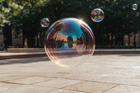 Iridescent Soap Bubble Floating in Sunlit Outdoor Setting