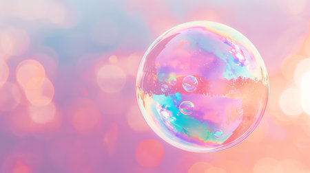 Iridescent soap bubble floating against softly blurred pastel bokeh background. Concept of delicate, colorful, dreamy, ethereal.. Copy space.