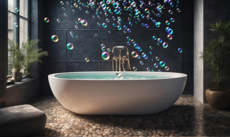 A white bathtub sits in a modern bathroom filled with water, with iridescent bubbles floating in the air above