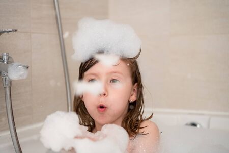 Young charming girl bathes in a bathtub with foam, blows on foam blowing bubbles