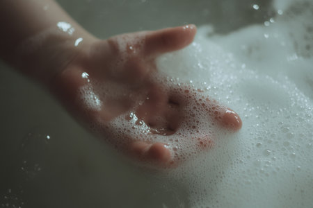 close-up of a hand covered in soap suds, surrounded by foam and bubbles in water