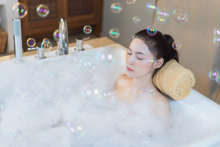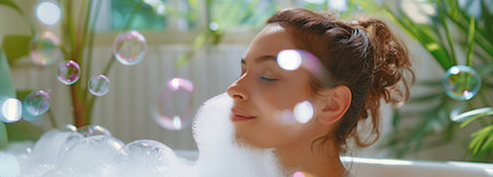 A young woman relaxing in a foam-filled bathtub, blowing bubbles with soap, enjoying herself. Idea for a tropical home spa