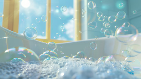 Soap bubbles floating above clawfoot bathtub filled with foam in a serene, sunlit bathroom, creating an atmosphere of tranquility and relaxation
