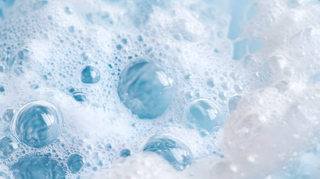 Close-up of soapy suds and bubbles on blue water, light reflections creating a fresh and clean texture.