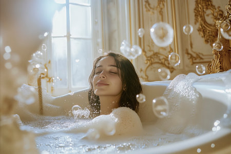 Young woman enjoying a luxurious bath in a vintage-style bathroom, surrounded by soap bubbles and soft sunlight