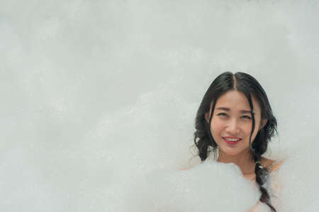 Experience a tranquil Mother's Day with a serene portrait A woman, softly embraced by ethereal foam, embodies love and relaxation This visual escape invites you to a world of calming bliss and gentle indulgence, exploring self-care through a soothing and emotive art piece AI Generative