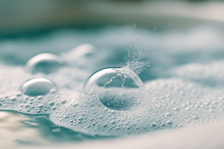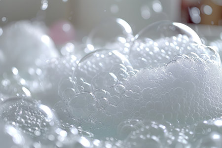 Thick detergent bubbles floating over water surface, reflecting vibrant colors. Clean look, natural light enhances the sparkle
