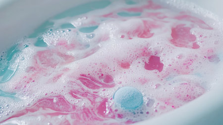 Sensory delight: Closeup of colorful foam after dissolving bath bomb in water, creating a spa atmosphere