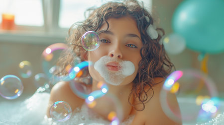 Young girl surrounded by bubbles in a colorful pink and blue bubble bath, playful and relaxing atmosphere