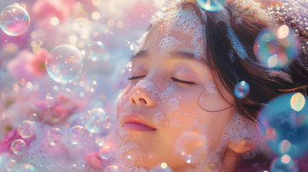 Relaxing Bubble Bath Bliss A Woman with Closed Eyes and a Pleasurable Smile Floating in a Tranquil Bath