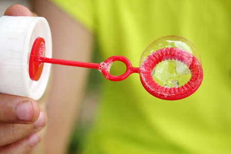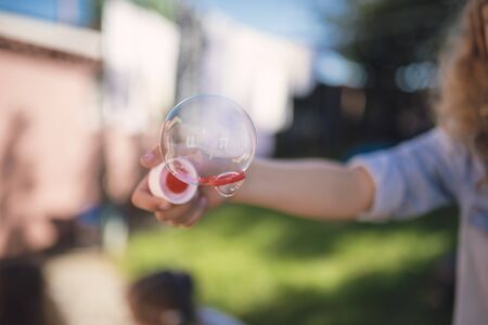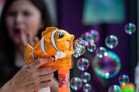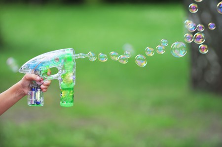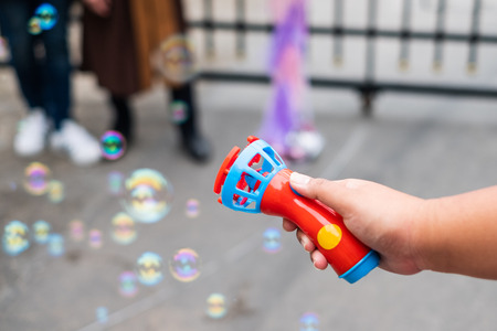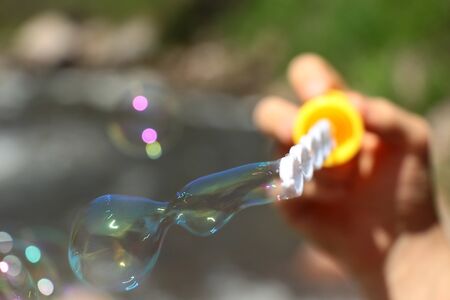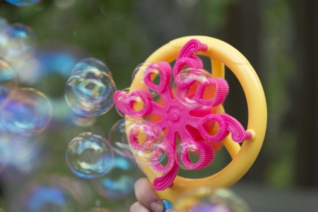 Childrens toy soap bubble blower creating bubbles on sunny summer day