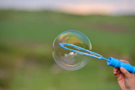 Inflated soap bubble on a bright summer background, selective focus and shallow depth of field