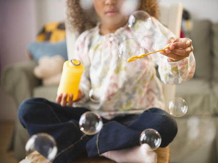 Mixed race girl playing with bubbles