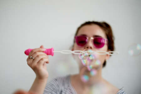Close up side view shot of young female model blowing soap bubbles on white background. Focus on hands and wand.