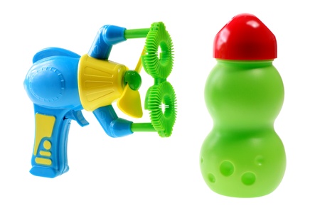 Toy gun shooting bubbles in the air isolated on black background