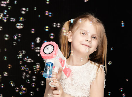 Child blonde girl 6 years old in a white dress on a dark background among air bubbles