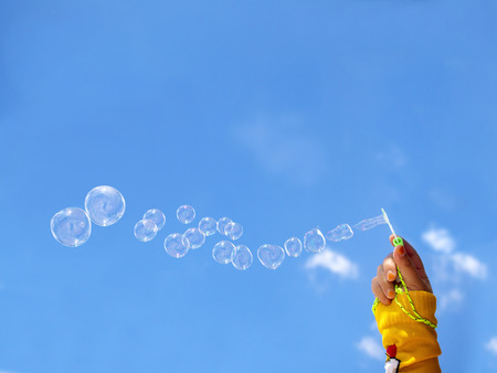 childs hand holding a wand for blowing soap bubbles against the blue sky on a sunny summer day