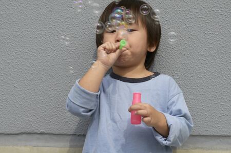 Young Asian girl having fun with soap bubbles toy.