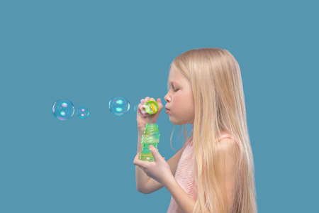 kid in white t-shirt blowing soap bubbles on blue background