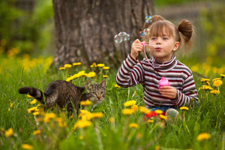 Portrait of funny lovely little girl and a cat, blowing soap bubbles