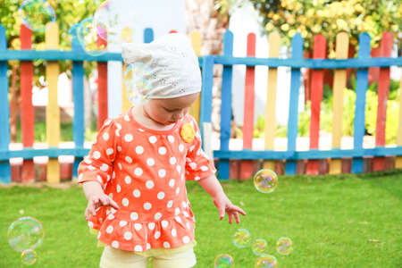happy toddler girl running and playing soap bubble in the park