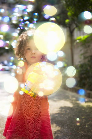 Girl Wearing Dress Using Bubble Gun Blowing Bubbles