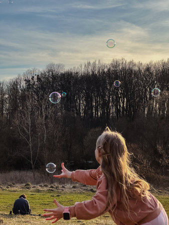 In a public park, a little girl blows and catches soap bubbles. The child is playing and laughing. The bubbles shimmer in the sun and fly in different directions.