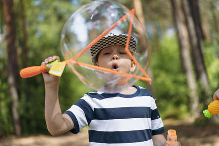 cute caucasian boy blowing huge soap bubble . high quality photo