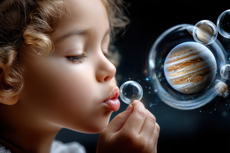 A young child blows bubbles, one reflecting a planet amidst a serene cosmic environment.