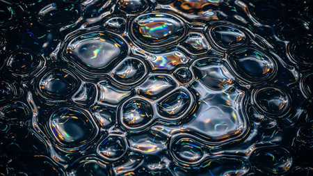 AI Generated. Iridescent Soap Bubbles Floating in Dark Water Background