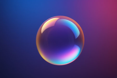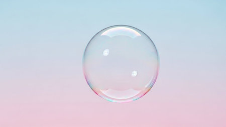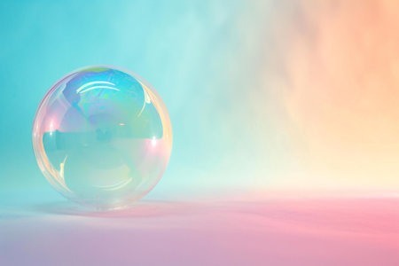 A single transparent soap bubble floats in the center against a soft gradient background transitioning from pink to blue, showcasing iridescent...