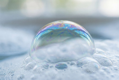A single transparent soap bubble with rainbow iridescence rests on a texture of white foam bubbles with a bright and clean blurred area for copy space.