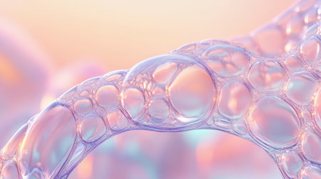 A macro shot of soap bubbles with iridescent colors, reflecting light, and a blurred, warm-toned background, creating a dreamy atmosphere.