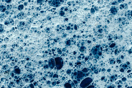 Soap bubbles on a background of blue water as a texture. Top view. Copy, empty space for text.