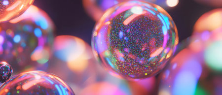 This abstract illustration features numerous bubbles of varying sizes, exhibiting diverse colors and textures. The composition appears to be digitally rendered, suggesting a conceptual or scientific theme. The bubbles float against a dark background, and this could be applicable to design and educational projects.