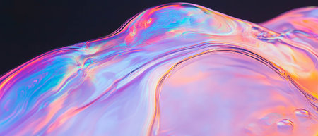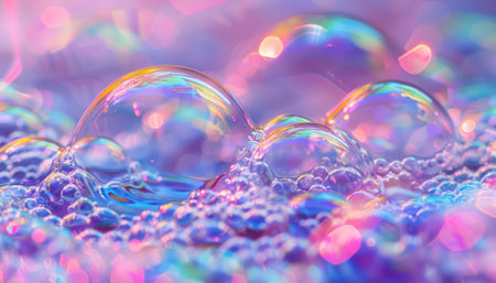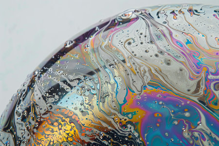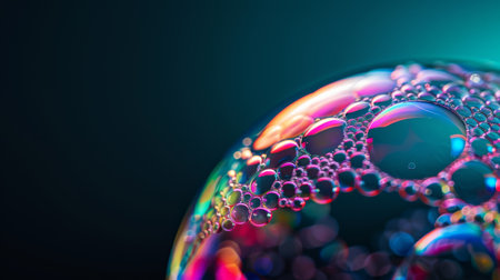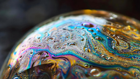 Close up of soap bubble rainbow reflection with whimsical colorful texture seamless wallpaper background luminous surface detail abstract light pattern for design decoration dreamy style