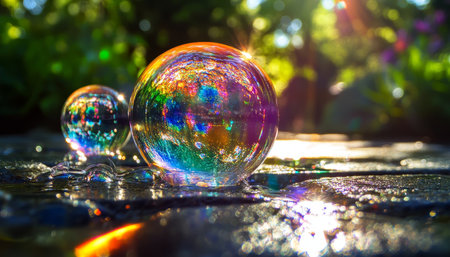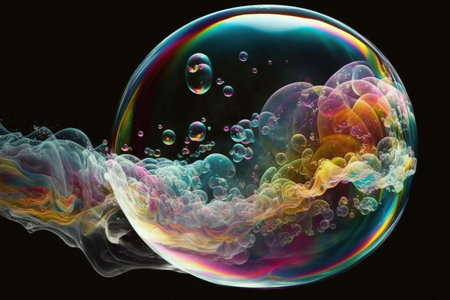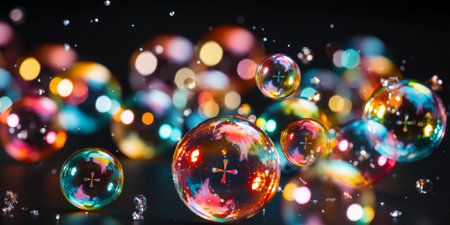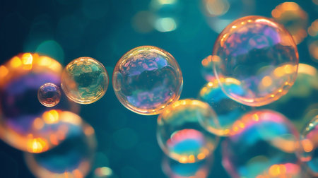 bubbles float gently through the air, their delicate, translucent spheres glistening in the light, creating a mesmerizing display of iridescent colors and shimmering reflections, evoking a sense of wonder and magic in this captivating, high-quality image of soap bubbles. ai generated