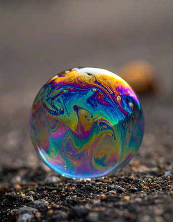 A single, fragile soap bubble rests on a dark, textured surface, its iridescent skin swirling with a universe of psychedelic colors.