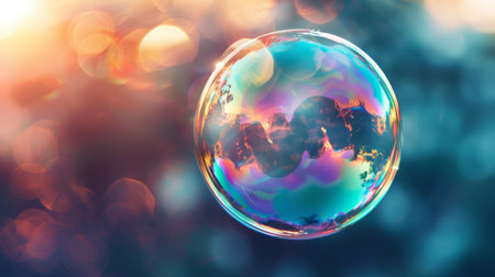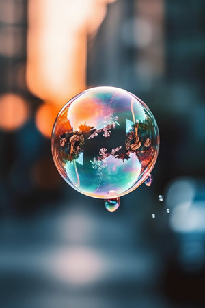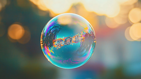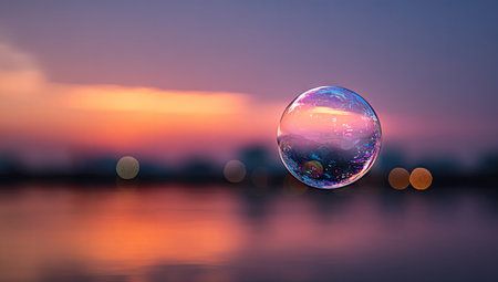 A shimmering soap bubble at sunset, with the sky warm colors mirrored on its fragile surface, floating against a dreamy backdrop.