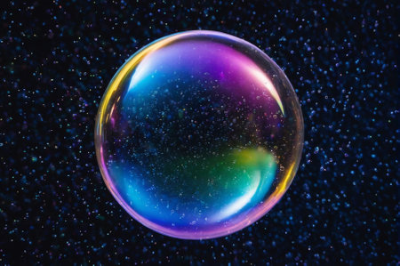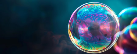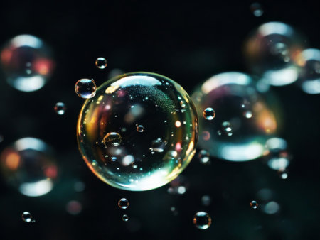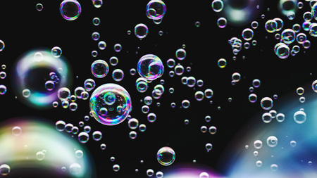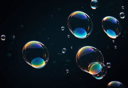 Floating soap bubbles with iridescent colors and soft movement against a dark background
