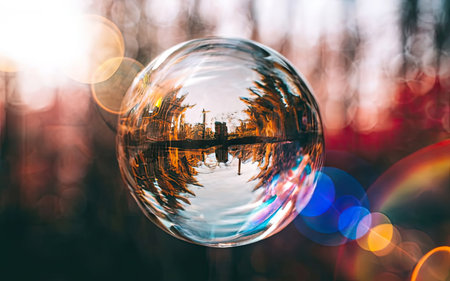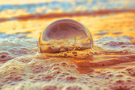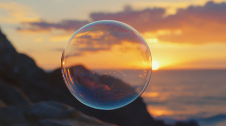A transparent soap bubble sits on a reflective surface, showcasing a sunset reflected within. The image displays vibrant colors, with the bubble mirroring the orange and purple hues of the sky. The composition emphasizes the play of light and reflection, creating a sense of serenity. Suitable for various visual communication projects.