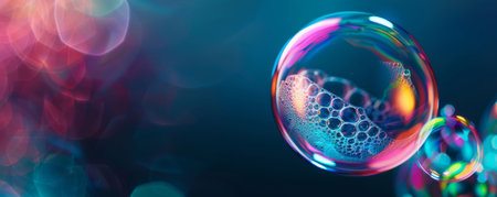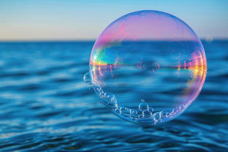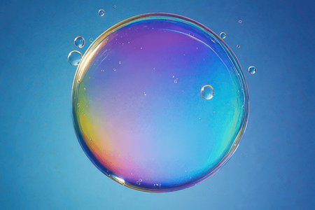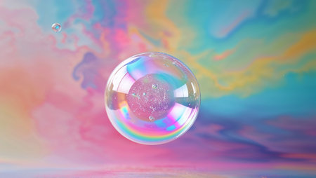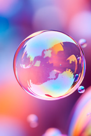 Large soap bubble with an iridescent surface floats against a vibrant pastel background, with smaller bubbles adding to the dreamlike atmosphere. Ai generated image