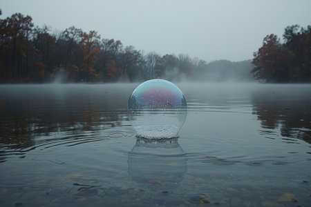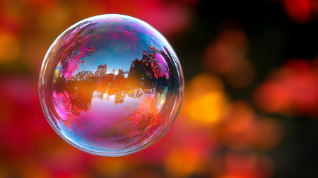 A beautiful transparent soap bubble hovers in the air, reflecting the vibrant colors of autumn foliage in a soft, dreamy background. The bokeh creates a magical atmosphere, enhancing the natural beauty and tranquility of the scene.