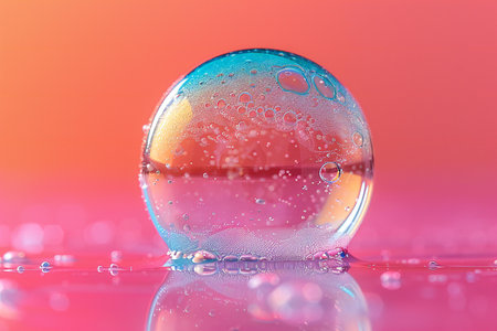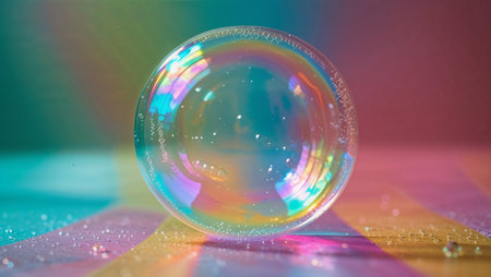 Large soap bubble with rainbow reflections resting on a multicolored surface with water drops. Ai generated image