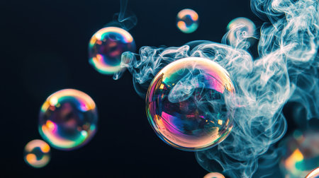 Captivating scene featuring vibrant soap bubbles reflecting colors and surrounded by wispy smoke, perfect for artistic projects or creative visuals.